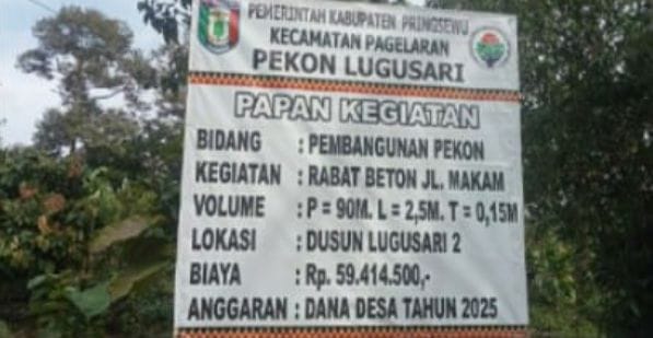 PRINGSEWU – Pemerintah Pekon Lugusari, Kecamatan Pagelaran, Kabupaten Pringsewu, Lampung, merealisasikan pembangunan jalan rabat beton menuju lokasi makam di Dusun Lugusari 2. Proyek ini dibiayai melalui Dana Desa Tahun Anggaran 2025 dengan total anggaran sebesar Rp 59.414.500.