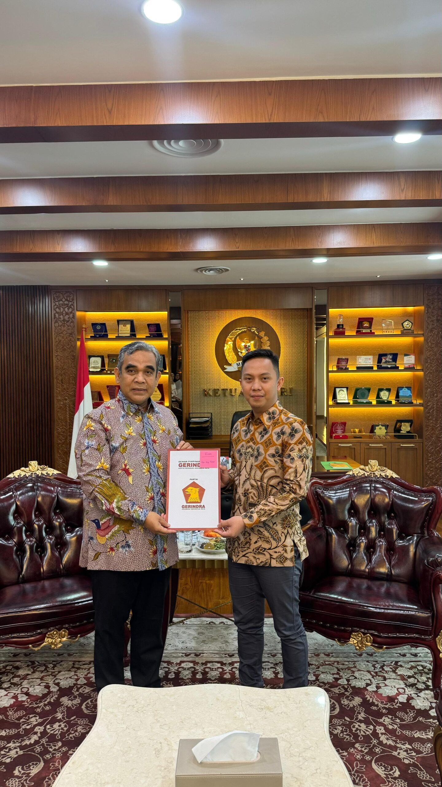 Way Kanan – Dewan Pimpinan Pusat (DPP) Partai Gerindra resmi menyerahkan surat rekomendasi kepada Galang Putra Rahman sebagai calon Wakil Bupati Way Kanan. Penyerahan rekomendasi ini dilakukan langsung oleh Sekretaris Jenderal Partai Gerindra, Ahmad Muzani, bertempat di kantor Ketua MPR RI di Jakarta, Rabu (25/06/2025).
