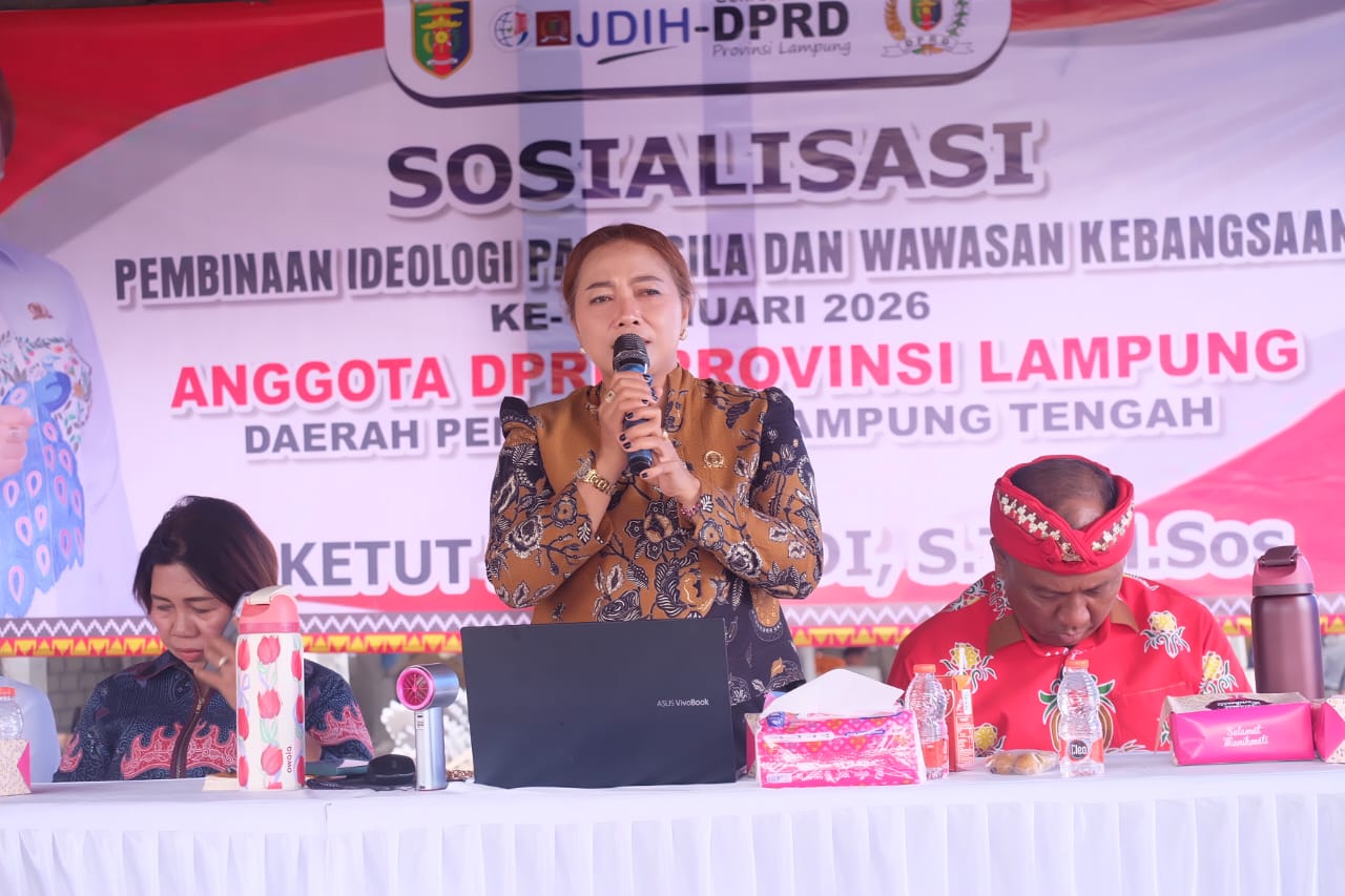 SEPUTIH RAMAN – Anggota DPRD Provinsi Lampung Fraksi PDI Perjuangan Daerah Pemilihan (Dapil) 7 Lampung Tengah Ni Ketut Dewi Nadi, S.T, melaksanakan Sosialisasi Pembinaan Ideologi Pancasila dan Wawasan Kebangsaan (PIPWK) ke-1 Januari 2026.