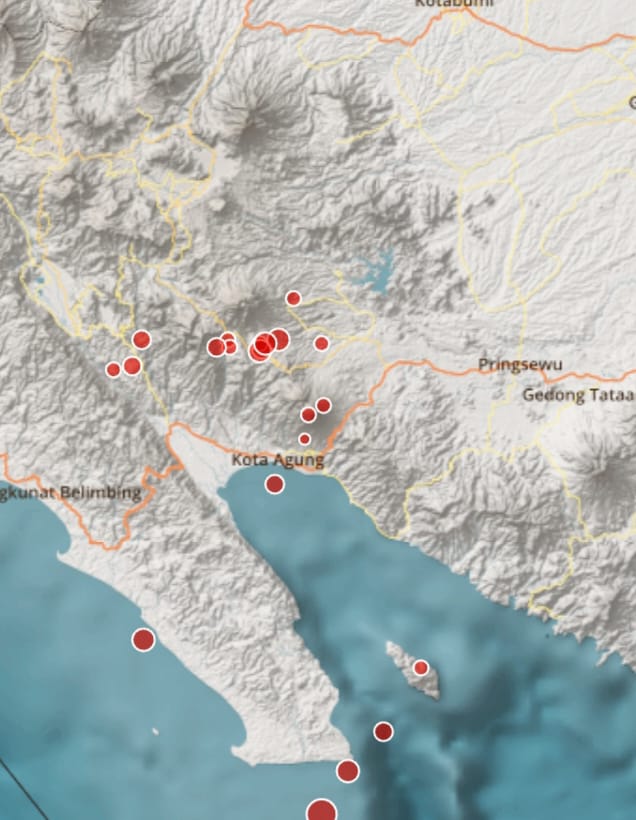Aktivitas seismik berlanjut pada pukul 02.07 WIB dengan gempa M2,3 di kedalaman 4 kilometer, berpusat di laut 46 kilometer tenggara Tanggamus. Sementara itu, gempa pendahulu tercatat pada Senin malam (16/2/2026) pukul 23.39 WIB dengan magnitudo 1,8 di darat sekitar 39 kilometer tenggara Tanggamus pada kedalaman 35 kilometer.